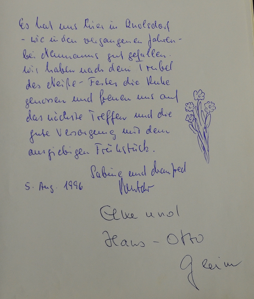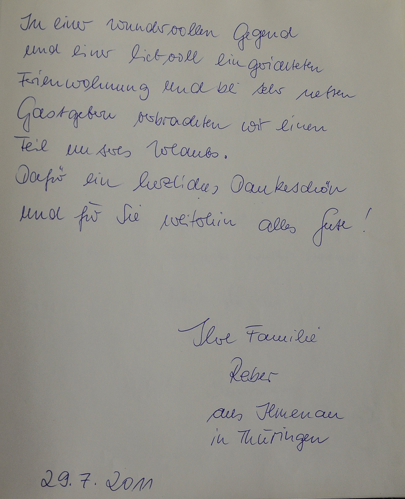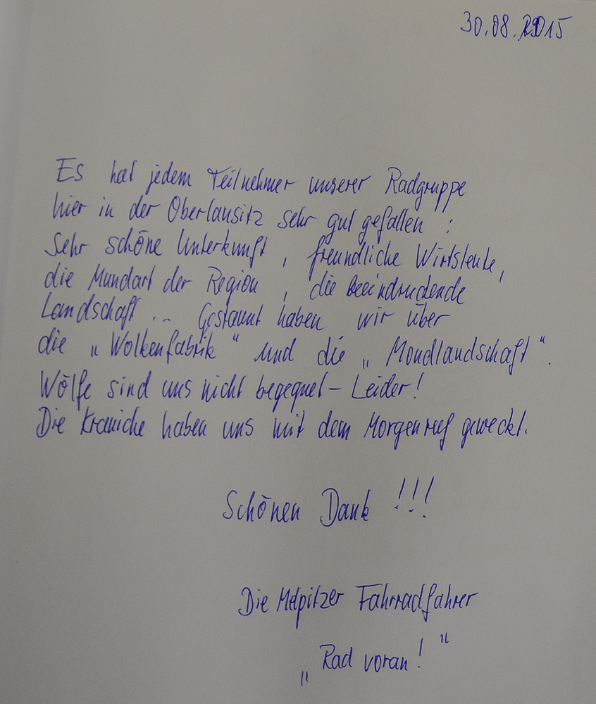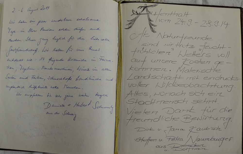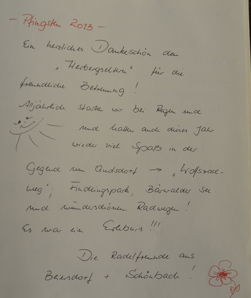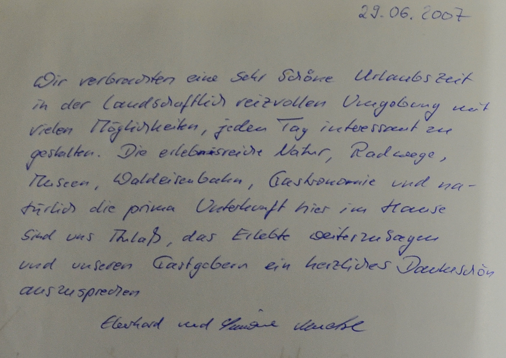 Wir haben von netten Gästen ehrende Einträge in unser Gästebuch als schöne Erinnerungen erhalten. Es liegt bei uns in der Pension aus (kein Online-Gästebuch).
