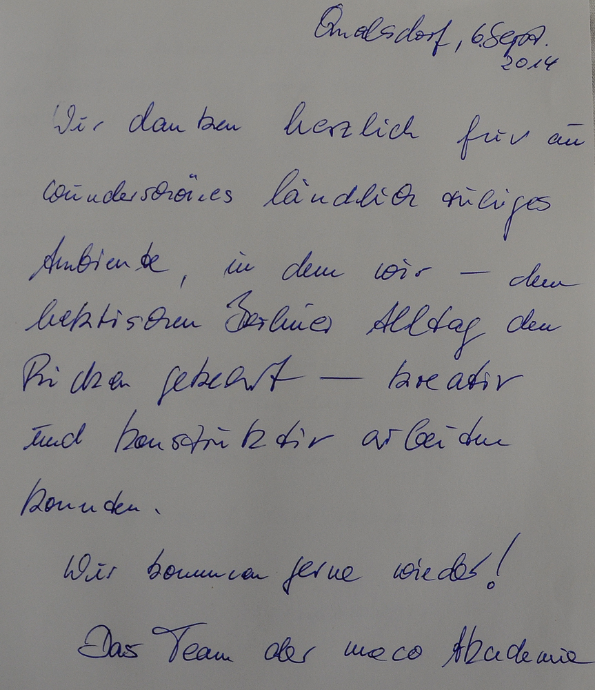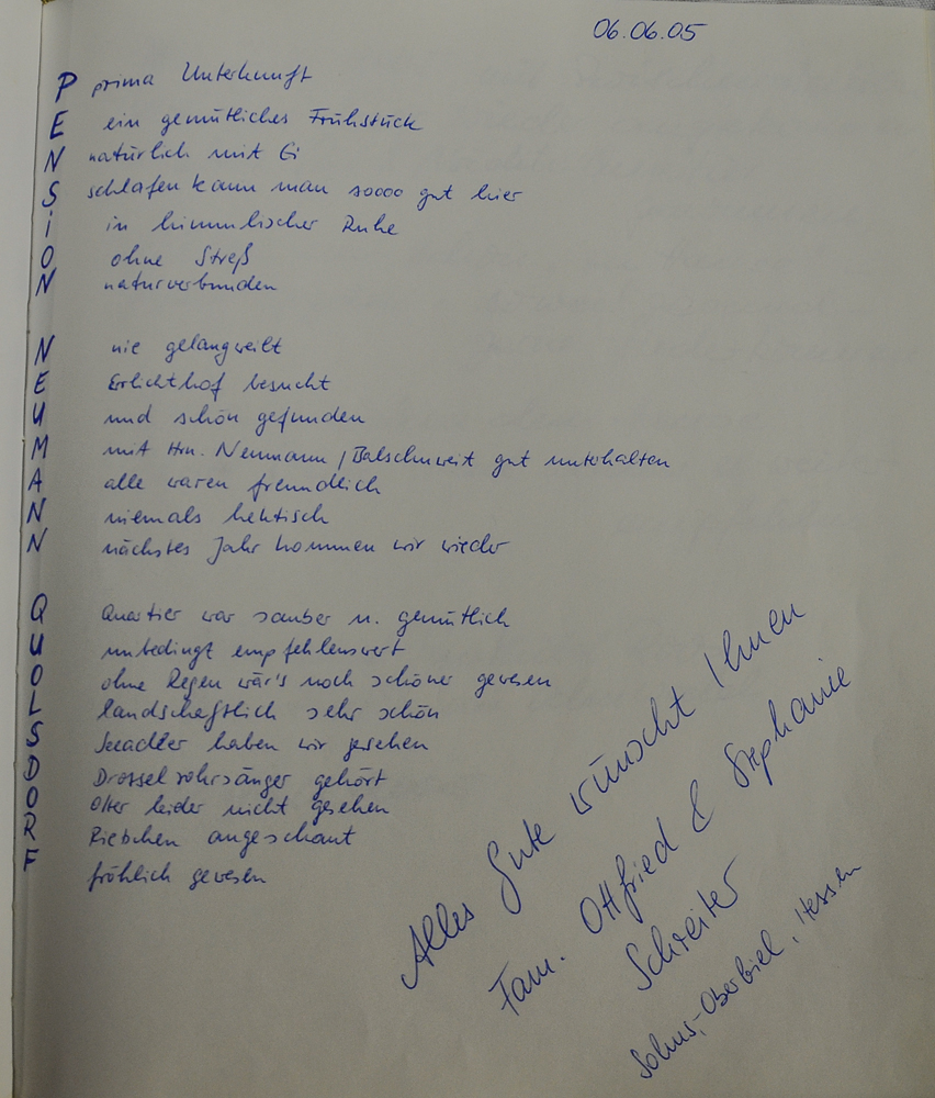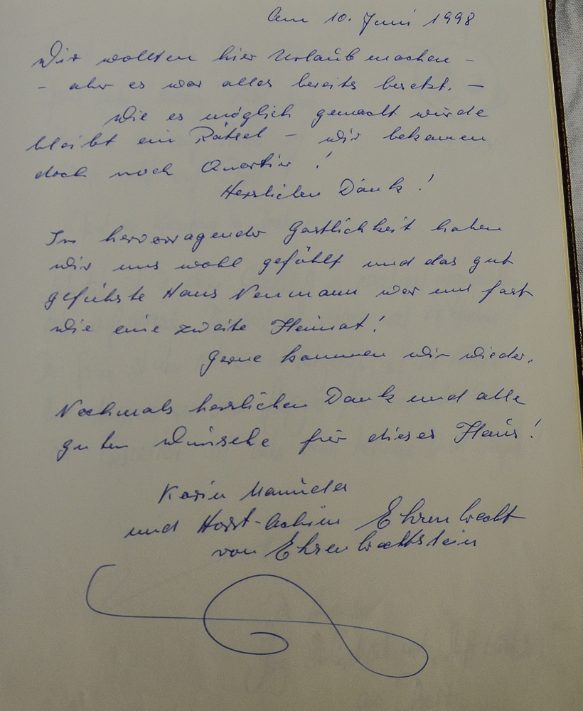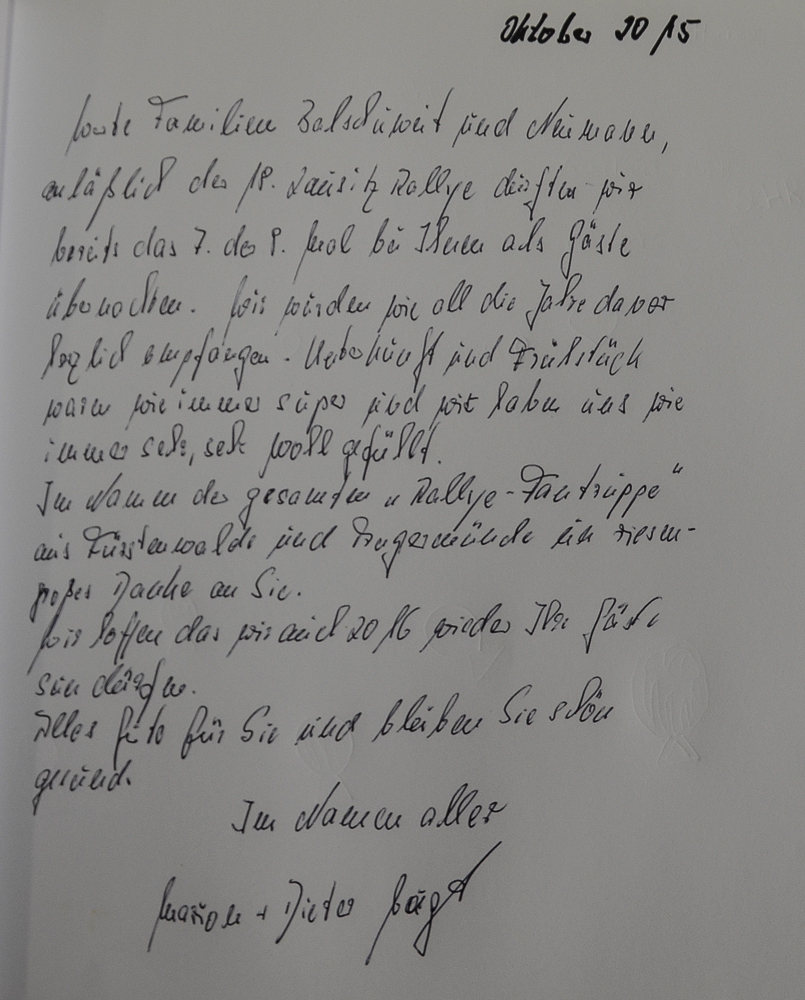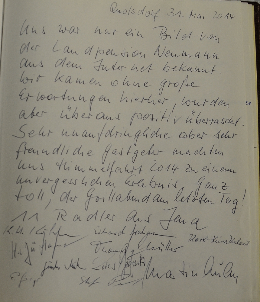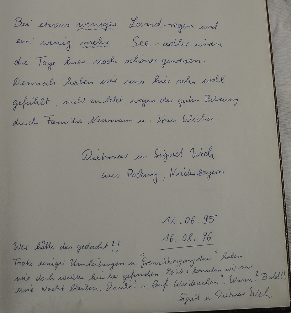 Wir haben von netten Gästen ehrende Einträge in unser Gästebuch als schöne Erinnerungen erhalten. Es liegt bei uns in der Pension aus (kein Online-Gästebuch).